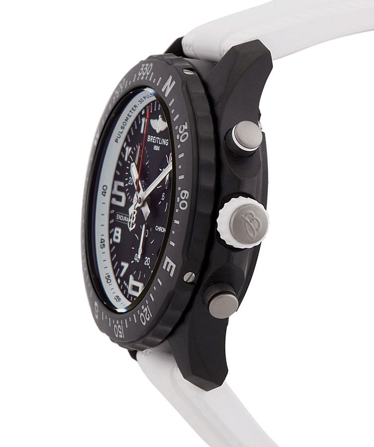 Experience the perfect combination of style and functionality with the Breitling Endurance Pro 38 X83310A71B1S1 timepiece. This watch features a sleek black dial adorned with Arabic numeral hour markers, a convenient date display, and a versatile chronograph function. The pulsometer adds a touch of sophistication, while the 38mm black Breitlight case ensures durability. Navigate with ease using the bidirectional rotating bezel with a compass scale, and enjoy a comfortable fit with the white rubber strap and tang buckle. Powered by superquartz technology, this chronometer-certified watch is a reliable companion for your active lifestyle.